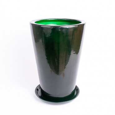 Donica ceramiczna okrągła w odcieniu zielonego połysku. Posiada otwór na spodzie oraz podstawkę w tym samym odcieniu.