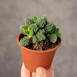 Adromischus marianae f. herrei to wyjątkowy, kolekcjonerski sukulent o oryginalnym, wręcz rzeźbiarskim wyglądzie. Jego krótkie, mięsiste liście mają nieregularną, chropowata powierzchnię i przybierają barwy od zielonej, przez oliwkową, aż po bordo czy fiolet - zwłaszcza przy intensywnym świetle. Rośnie powoli, tworząc zwarte, kompaktowe kępy. Jest rośliną bardzo wdzięczną w uprawie: wymaga jasnego stanowiska, oszczędnego podlewania i dobrze przepuszczalnego podłoża. Idealny dla miłośników nietypowych sukulentów i osób ceniących rośliny o unikatowych teksturach.