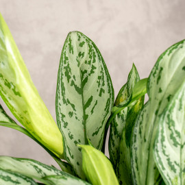 Aglaonema 'Silver Queen' o charakterystycznych pstrokatych liściach w odcieniach zieleni i srebra jest jedną z najbardziej pożądanych roślin do wnętrz.