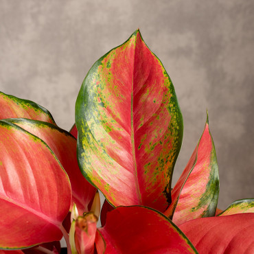 Aglonema 'China Red' to orientalna piękność o niespotykanym, intensywnie czerwonym wybarwieniu liści. Ma zwarty, kępiasty pokrój i dorasta do 50 cm wysokości. Duże, lancetowate i szerokie liście osadzone są na jasnoróżowych ogonkach i niemal całkowicie wybarwione na unikalny, jaskrawy i rzadko spotykany u roślin odcień czerwieni. Zieleń umiejscowiona jest głównie na obrzeżach liści i tworzy cienki margines lub szeroką obwódkę.