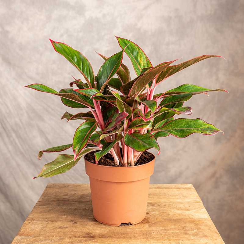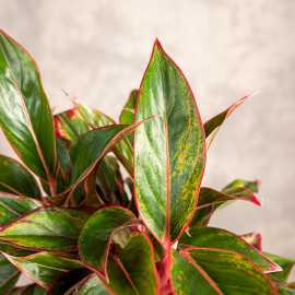 Aglonema 'King of Siam' to elegancka roślina doniczkowa o wyjątkowym wyglądzie. Jej duże, ciemnozielone liście są ozdobione kontrastującymi jasnymi żyłkami i różową obwódką, co nadaje roślinie królewskiego charakteru. Aglonema jest ceniona za swoją odporność i łatwość w uprawie.