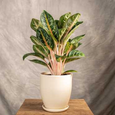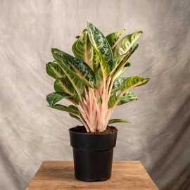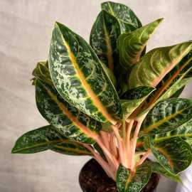 Aglonema 'Orange Flame' to tropikalna roślina wyróżniająca się niecodzienna kolorystyką. Skórzaste, lancetowate liście ozdobione szarozielonymi wzorkami osadzone są na delikatnie różowych ogonkach liściowych. Zwraca uwagę nie tylko kolekcjonerów.