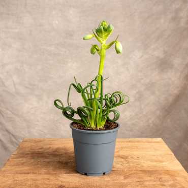 Albuca spiralis 'Frizzle Sizzle' to fascynująca roślina, znana ze swoich unikalnych, spiralnie skręconych liści i pięknych, pachnących kwiatów. Pochodzi z Afryki Południowej. Jest niewielką rośliną - osiąga do 30 cm wysokości. W okresie kwitnienia na długich, smukłych łodygach pojawiają się żółte, dzwonkowate kwiaty, które wydzielają delikatny zapach wanilii.
