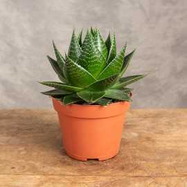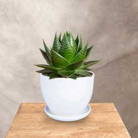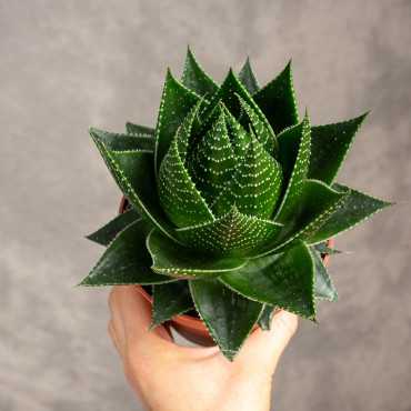 Aloes 'Cosmo' to kompaktowa, dekoracyjna roślina o zwartym, kształcie. Charakteryzuje się szerokimi, mięsistymi liśćmi w odcieniach zieleni z białymi plamkami i jasnymi obrzeżami. Idealny do uprawy na słonecznych parapetach.