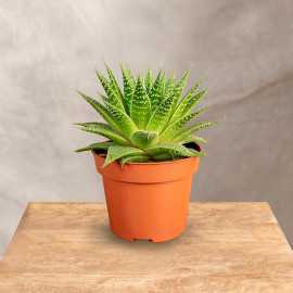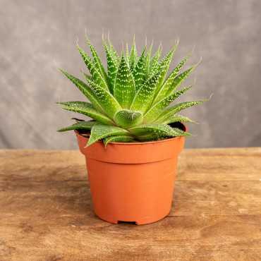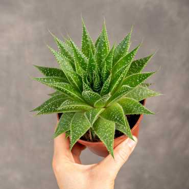 Aloes 'Gladiator Rock' to kompaktowa, efektowna roślina o grubych, mięsistych liściach, które tworzą gęstą, symetryczną rozetę. Liście mają ciemnozielony kolor, ozdobione są białymi kropkami i delikatnymi, kolczastymi brzegami, co nadaje roślinie surowy, ale elegancki wygląd.