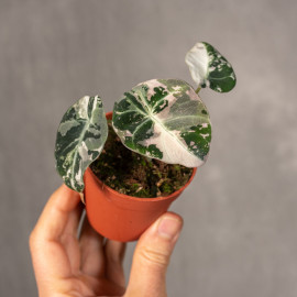 Alocasia Black Velvet Pink Variegata to rzadko spotykana, kolekcjonerska perełka o oszałamiającym kontraście – głęboko zielone, niemal czarne liście o aksamitnej strukturze zdobią jasnoróżowe i pudrowo-białe przebarwienia.