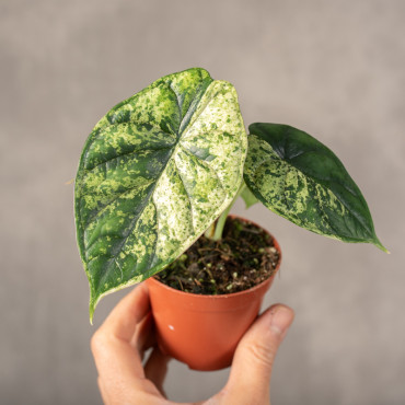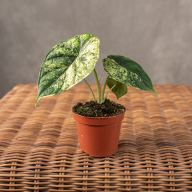 Alocasia 'Dragon Scale' Mint Variegata to rzadka, kolekcjonerska odmiana o skórzastych, sercowatych liściach, które przypominają miętowo-zielone smocze łuski z ciemniejszym, wyżłobionym unerwieniem. Ta kompaktowa roślina łączy głęboką zieleń z pastelowymi plamami, tworząc efekt trójwymiarowości, idealny do jasnych wnętrz.
