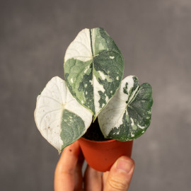 Alokazja 'Melo' Variegata to rzadka, kolekcjonerska roślina o niezwykle grubych, sztywnych liściach przypominających skórę smoka lub słonia. Wyróżnia się chropowatą fakturą, głębokim unerwieniem oraz marmurkowymi przebarwieniami w odcieniach bieli, kremu lub żółci. Jest to kompaktowa, wolno rosnąca odmiana.