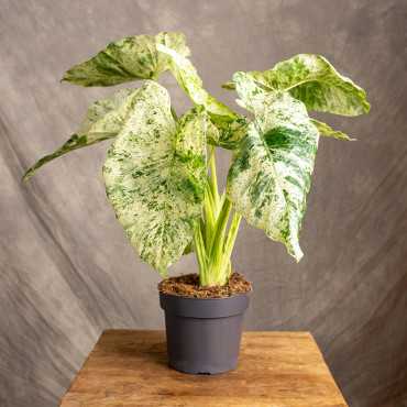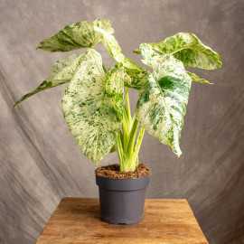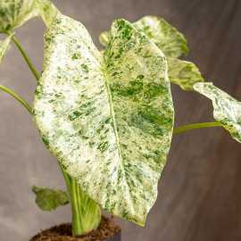 Alokazja odora 'Variegata Batik' znana ze swoich pięknie wybarwionych liści. Są zielone z nieregularnymi, białymi przebarwieniami, tworząc unikalne, marmurkowe wzory. Wzór jest różnorodny, co oznacza, że każdy liść może wyglądać nieco inaczej, dodając roślinie dynamicznego i artystycznego charakteru.
