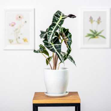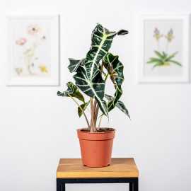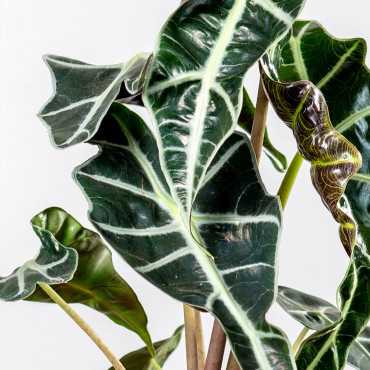 Alokazja amazońska 'Polly' - wyróżnia się liśćmi o pięknym obrazku. Alokazja nie jest prosta w uprawie ale tym którzy potrafią o nią zadbać odwdzięcza się swoją urodą. Alokazja to jedna z najpiękniejszych ozdób jakie możemy umieścić w naszym domu. Jej uroda jest kwintesencją dzisiejszych minimalistycznych zielonych trendów, w których dominują ozdobne liście o oryginalnym kształcie i rysunku. Alokazja jest wyrafinowana w każdym: jej liście to małe dzieło sztuki, ozdobą są również barwne łodygi. Roślina pochodzi z rejonów tropikalnych i w takich warunkach najlepiej się czuje.