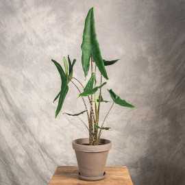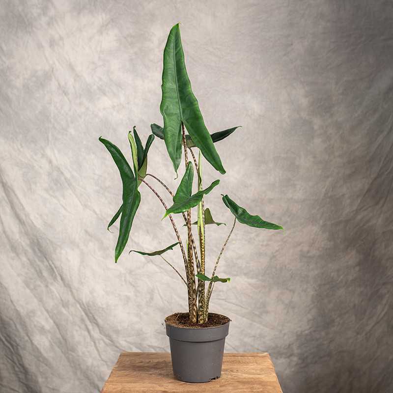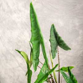 Alokazja 'Tigrina' to bliska kuzynka znanej alokazji zebriny. Ma długie, prążkowane ogonki liściowe i ciemnozielone, strzałkowate i mocno wydłużone liście.