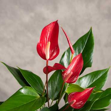 Anturium 'Banderola Roja' to roślina doniczkowa o efektownych, intensywnie czerwonych kwiatach i zielonych, błyszczących liściach. Anturium jest rośliną pochodzącą z tropikalnych obszarów, dlatego wymaga stałej temperatury i podwyższonej wilgotności powietrza. Kwitnie przez większą część roku.