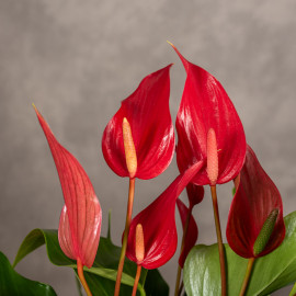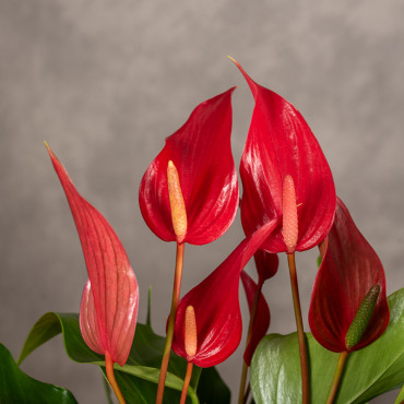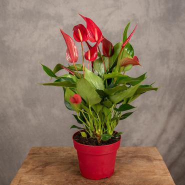 Anturium 'Banderola Roja' to roślina doniczkowa o efektownych, intensywnie czerwonych kwiatach i zielonych, błyszczących liściach. Anturium jest rośliną pochodzącą z tropikalnych obszarów, dlatego wymaga stałej temperatury i podwyższonej wilgotności powietrza. Kwitnie przez większą część roku.