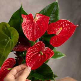 Anturium 'Valera' czerwono kwitnące Anthurium z grupy andreanum. Klasyczne anturium o dużych kwiatach i ciemno zielonych liściach.