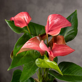 Anturium 'Floriclone Romantico' to odmiana, która od pierwszego spojrzenia zachwyca swoją elegancją i subtelnym urokiem. Jej kwiatostany mają delikatny, różowy odcień z lekko połyskującą, satynową powierzchnią, a liście są duże, soczyście zielone i błyszczące - stanowią idealne tło dla pastelowych kwiatów, podkreślając ich intensywność i świeżość.