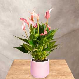 Anturium 'Lilli Pink' to niezwykła roślina przypominająca skrzydłokwiat. Ma podłużne, cienkie liście i ostro zakończone, strzeliste kwiaty (pochwy kwiatowe) w kolorze jaskrawego różu.