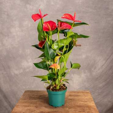 Anturium 'Melito' to wyjątkowe anturium o intensywnie malinowych, błyszczących kwiatach i ciemnozielonych, sercowatych liściach, które tworzą wyrafinowaną, elegancką kompozycję. Jego kwiaty mają lśniącą powierzchnię i piękny, głęboki kolor, który przyciąga uwagę. Dzięki swoim długotrwałym kwiatostanom 'Melito' jest wspaniałym wyborem jako roślina ozdobna, zarówno do biura, jak i do salonu.