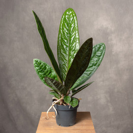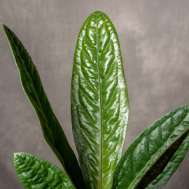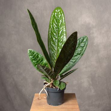Anthurium superbum to niezwykle efektowna i kolekcjonerska roślina, ceniona za duże, sztywne, silnie pofałdowane liście o głębokim, ciemnozielonym kolorze. Tworzy zwartą, rozetową formę, która nadaje jej monumentalny i bardzo egzotyczny charakter - to roślina, obok której trudno przejść obojętnie.