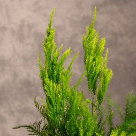 Asparagus setaceus 'Pyramidalis' to niezwykle dekoracyjna odmiana szparaga pierzastego, która wyróżnia się gęstym, stożkowatym pokrojem przypominającym miniaturowe drzewko w formie piramidy. Jej delikatne, pierzaste pędy tworzą lekką, puszystą strukturę, która dodaje wnętrzom lekkości i naturalnego uroku. To roślina, która świetnie sprawdza się zarówno w nowoczesnych, jak i bardziej klasycznych aranżacjach – jako roślinna rzeźba w donicy.