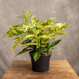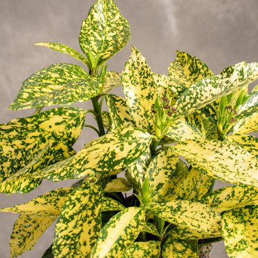 Aukuba japońska 'Variegata' to elegancka roślina o wyjątkowych, dekoracyjnych liściach, które przyciągają wzrok. Charakteryzuje się zimozielonymi, skórzastymi liśćmi, które mają piękne, kremowo-żółte plamy lub brzegi, tworzące kontrast z ciemnozielonym tłem.