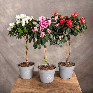 Azalia poprowadzona na pniu w formie drzewka. Liście są drobne, skórzaste, od spodu szarozielone. Azalie są ozdobne z kwiatów, które pojawiają się głównie w okresie zimowo – wiosennym. Kwiaty są dwubarwne, pojedyncze, przypominające kwiaty jabłoni.
