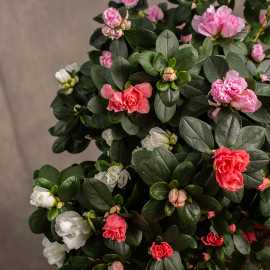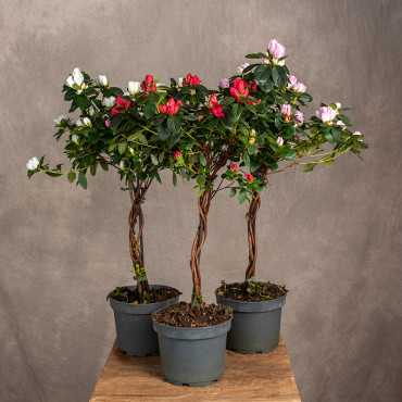 Azalia poprowadzona na pniu w formie drzewka. Liście są drobne, skórzaste, od spodu szarozielone. Azalie są ozdobne z kwiatów, które pojawiają się głównie w okresie zimowo – wiosennym. Kwiaty są dwubarwne, pojedyncze, przypominające kwiaty jabłoni.