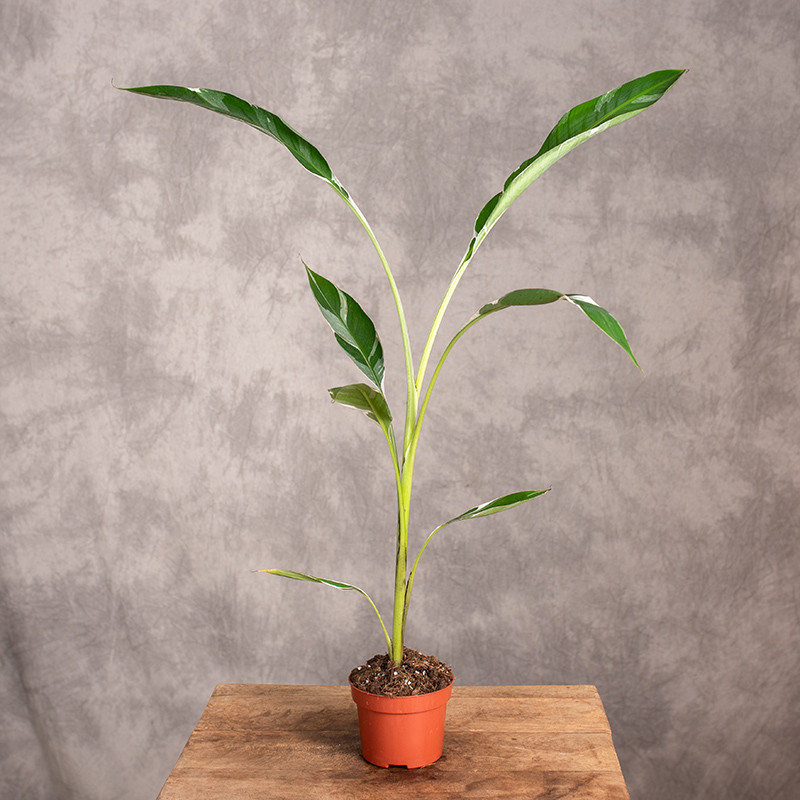 Musa 'Florida Variegata' to prawdziwy rarytas wśród roślin tropikalnych - zachwyca dużymi, rozłożystymi liśćmi ozdobionymi nieregularnym, kremowo-zielonym marmurkiem. Każdy liść to małe dzieło sztuki natury - unikalny wzór, który sprawia, że roślina przyciąga wzrok w każdej aranżacji.