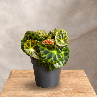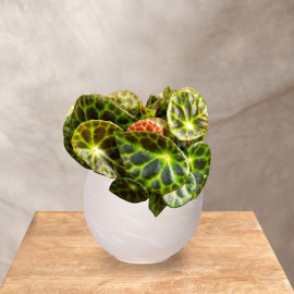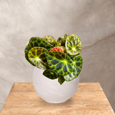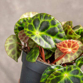 Begonia Kingiana to wyjątkowa odmiana, która zachwyca delikatnymi, mięsistymi liśćmi o asymetrycznym kształcie. Jej liście mają głęboki zielony kolor z bordowym akcentem, który w zależności od warunków oświetleniowych może się zmieniać. Na ich powierzchni często pojawia się subtelny połysk, nadający roślinie elegancki, lekko aksamitny wygląd.