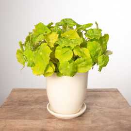 Piękna odmiana o intensywnie limonkowych, nieregularnych liściach osadzonych na długich ogonkach liściowych.