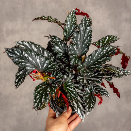 Begonia maculata 'Spotlight Dark' to wyjątkowa odmiana, która zachwyca kontrastem barw i dekoracyjnością liści. Jej wydłużone, ciemnozielone, wręcz czarne blaszki ozdobione są efektownymi, srebrzystymi kropkami, a od spodu mają intensywnie bordowy odcień. Całość tworzy spektakularny, niemal graficzny efekt, dzięki któremu roślina staje się prawdziwą ozdobą wnętrza.