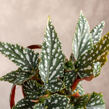 Begonia maculata 'Spotlight Grey' to niezwykle efektowna roślina doniczkowa, która przyciąga uwagę swoimi unikalnymi liśćmi. Ich zielono-szary odcień z srebrnymi plamkami oraz kontrastowy bordowy spód czynią ją prawdziwą gwiazdą wśród roślin domowych.