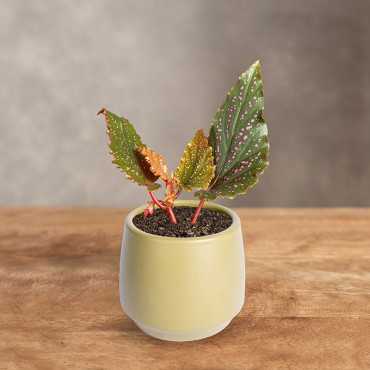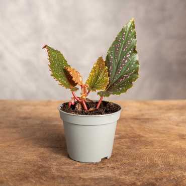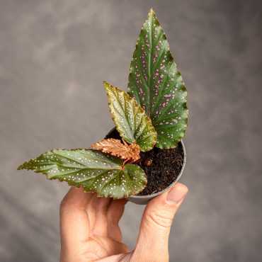 Begonia 'Polka Dot Pink' to uwielbiana kropkowana begonia, o liściach wyraźnie wybarwionych w odcieniach różu.