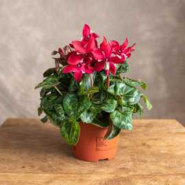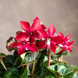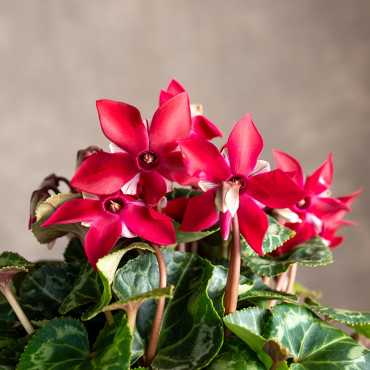 Cyklamen 'Djix Dark Red' to wyjątkowo efektowna roślina doniczkowa, która przyciąga uwagę swoimi intensywnie czerwonymi kwiatami. Jego piękne, lekko pofalowane płatki wznoszą się ponad sercowate, marmurkowe liście, tworząc niezwykle elegancki kontrast. Ta odmiana cyklamena doskonale nadaje się do dekoracji wnętrz, szczególnie w okresie jesienno-zimowym, kiedy większość roślin wchodzi w stan spoczynku.
