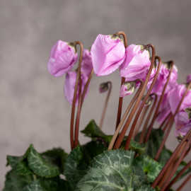 Cyklamen perski ‘Windbell’ to urocza, delikatna odmiana o niezwykłym wdzięku. Jej kwiaty przypominają małe dzwoneczki unoszące się nad sercowatymi, marmurkowymi liśćmi. Płatki w odcieniach różu i fuksji tworzą subtelną, romantyczną kompozycję, która rozświetla wnętrze w chłodniejsze dni. To roślina idealna do dekoracji domu w sezonie jesienno-zimowym- lubi chłodniejsze pomieszczenia, jasne, ale nie bezpośrednio nasłonecznione miejsca oraz umiarkowane podlewanie od spodu.