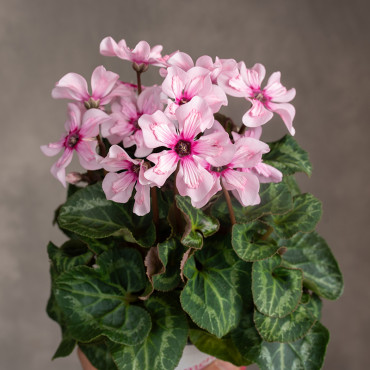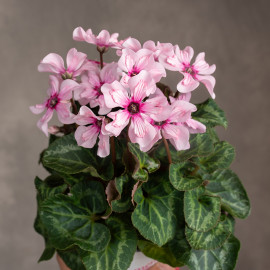 Cyklamen ‘Special Pink Illusia’ to elegancka odmiana o delikatnych, różowych kwiatach z ciemniejszym środkiem. Płatki uniesione do góry nadają roślinie lekkości i wdzięku, a całość pięknie komponuje się z dekoracyjnymi, sercowatymi liśćmi ozdobionymi wzorem. To odmiana, która długo i obficie kwitnie.