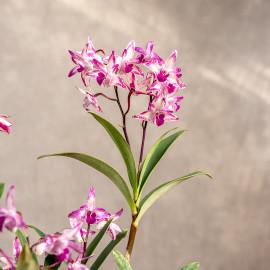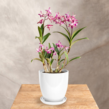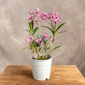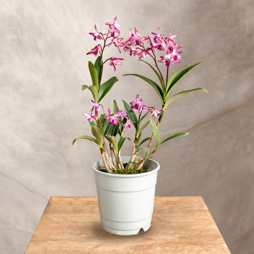 Dendrobium kingianum 'Splash' to wyjątkowa odmiana popularnego australijskiego storczyka, charakteryzująca się pięknymi, dwubarwnymi kwiatami. Płatki mają jasnoróżową lub białą bazę z efektownymi fioletowo-różowymi przebarwieniami w formie smug i plamek, co nadaje roślinie unikalny wygląd. Jest to storczyk epifityczny, który najlepiej rośnie w jasnym, rozproszonym świetle. Wymaga umiarkowanego podlewania i zapewnienia okresu spoczynku z niższymi temperaturami, co pobudza roślinę do kwitnienia. Kwitnie wiosną, a jego kwiaty wydzielają delikatny, przyjemny zapach.
