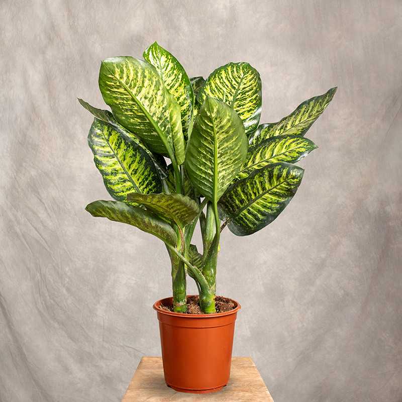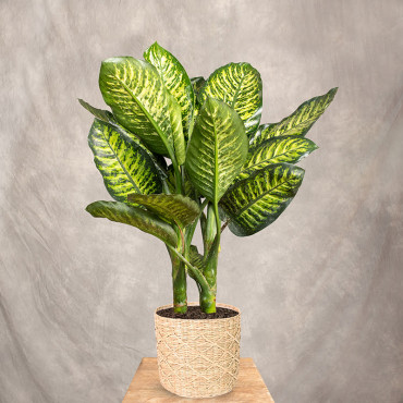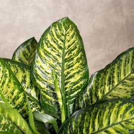 Dieffenbachia 'Maroba' to tropikalna roślina z dużymi, sztywnymi liśćmi z delikatnymi plamami w kolorze blado zielonym.