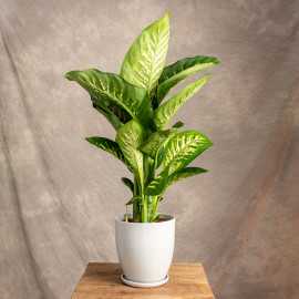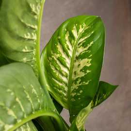 Difenbachia przybyła do Europy w XIX wieku z tropikalnych regionów Ameryki Południowej. Uwagę przyciągają dekoracyjne liście - duże, szerokie o charakterystycznym, oryginalnym, różnobarwnym rysunku. Roślina wymaga regularnej pielęgnacji, liście zawierają toksyczny sok mogący podrażnić skórę.