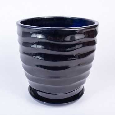 Donica ceramiczna okrągła z falowanym wzorem w odcieniu granatowego połysku. Posiada otwór na spodzie oraz podstawkę w tym samym odcieniu.