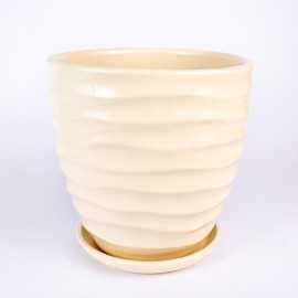 Donica ceramiczna okrągła z falowanym wzorem w odcieniu kremowego połysku. Posiada otwór na spodzie oraz podstawkę w tym samym odcieniu.