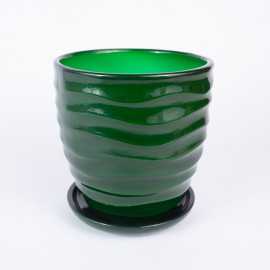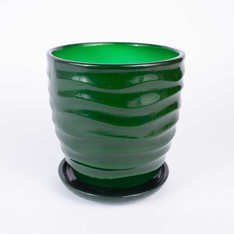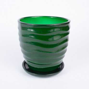Donica ceramiczna okrągła z falowanym wzorem w odcieniu zielonego połysku. Posiada otwór na spodzie oraz podstawkę w tym samym odcieniu.