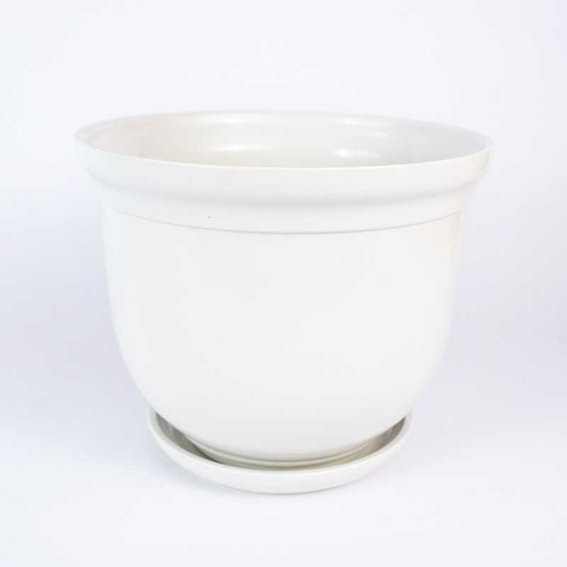Donica ceramiczna w kształcie okrągłej greckiej donicy w odcieniu białego połysku. Posiada otwór na spodzie oraz podstawkę w tym samym odcieniu.