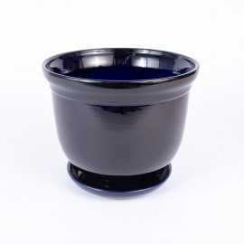 Donica ceramiczna w kształcie okrągłej greckiej donicy w odcieniu granatowego połysku. Posiada otwór na spodzie oraz podstawkę w tym samym odcieniu.