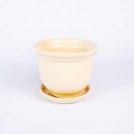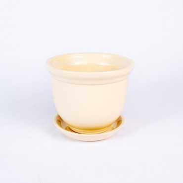 Donica ceramiczna w kształcie okrągłej greckiej donicy w odcieniu kremowego połysku. Posiada otwór na spodzie oraz podstawkę w tym samym odcieniu.
