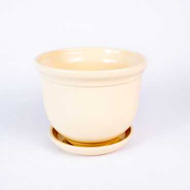 Donica ceramiczna w kształcie okrągłej greckiej donicy w odcieniu kremowego połysku. Posiada otwór na spodzie oraz podstawkę w tym samym odcieniu.