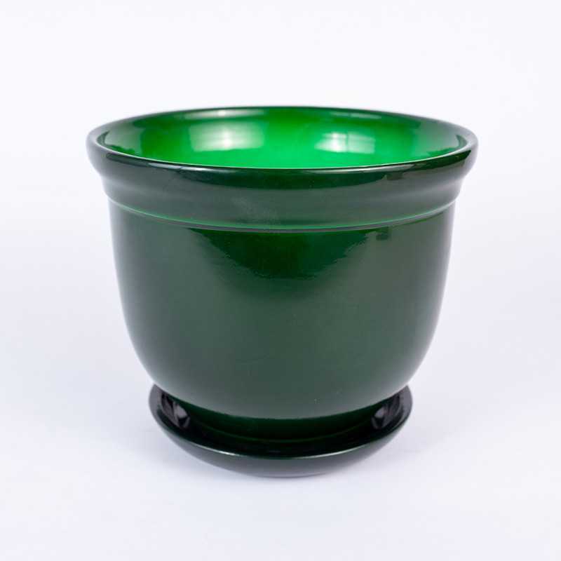 Donica ceramiczna w kształcie okrągłej greckiej donicy w odcieniu zielonego połysku. Posiada otwór na spodzie oraz podstawkę w tym samym odcieniu.