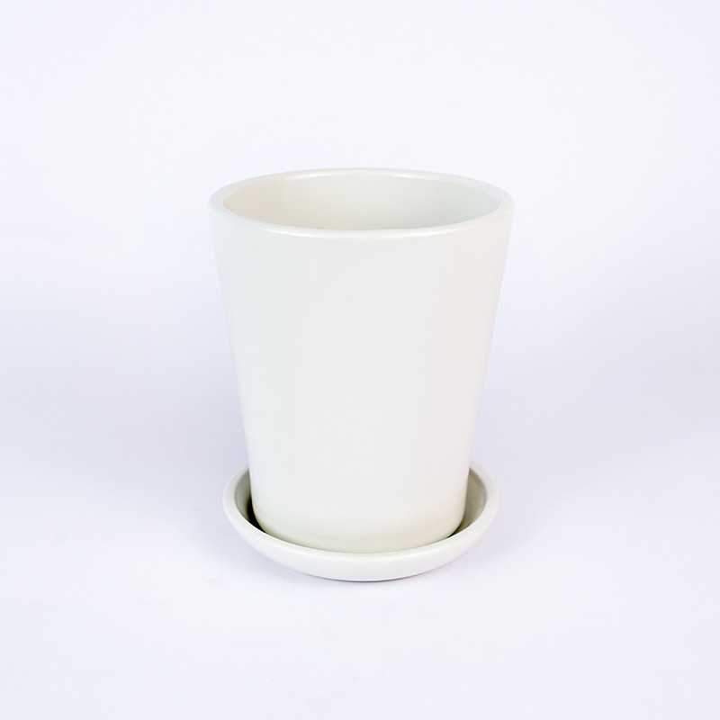 Donica ceramiczna okrągła w odcieniu białego połysku. Posiada otwór na spodzie oraz podstawkę w tym samym odcieniu.