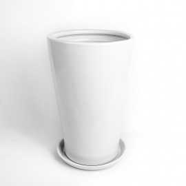 Donica ceramiczna okrągła w odcieniu białego połysku. Posiada otwór na spodzie oraz podstawkę w tym samym odcieniu.