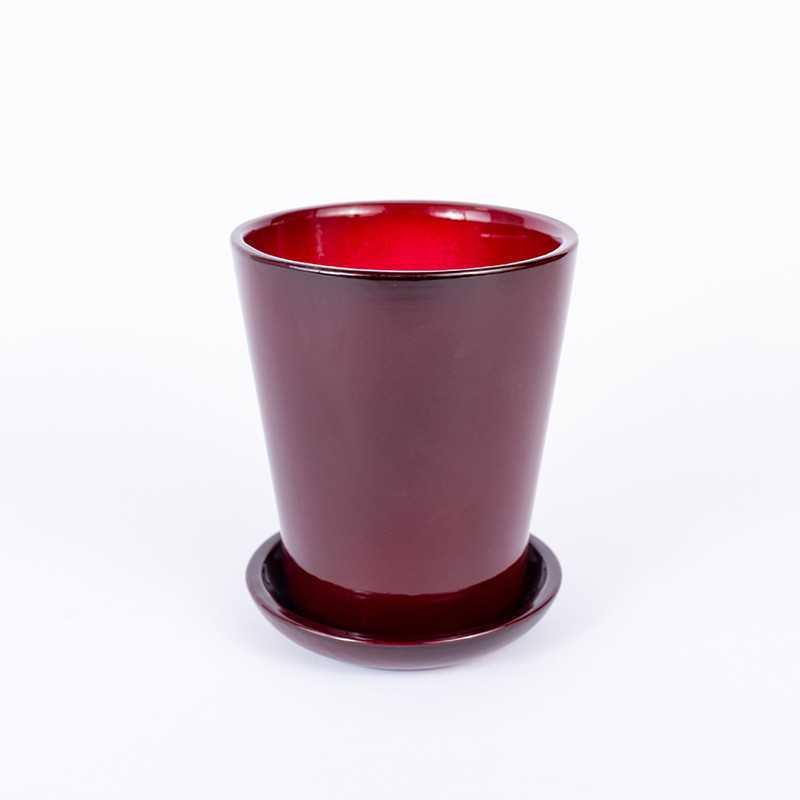 Donica ceramiczna okrągła w odcieniu bordowego połysku. Posiada otwór na spodzie oraz podstawkę w tym samym odcieniu.
