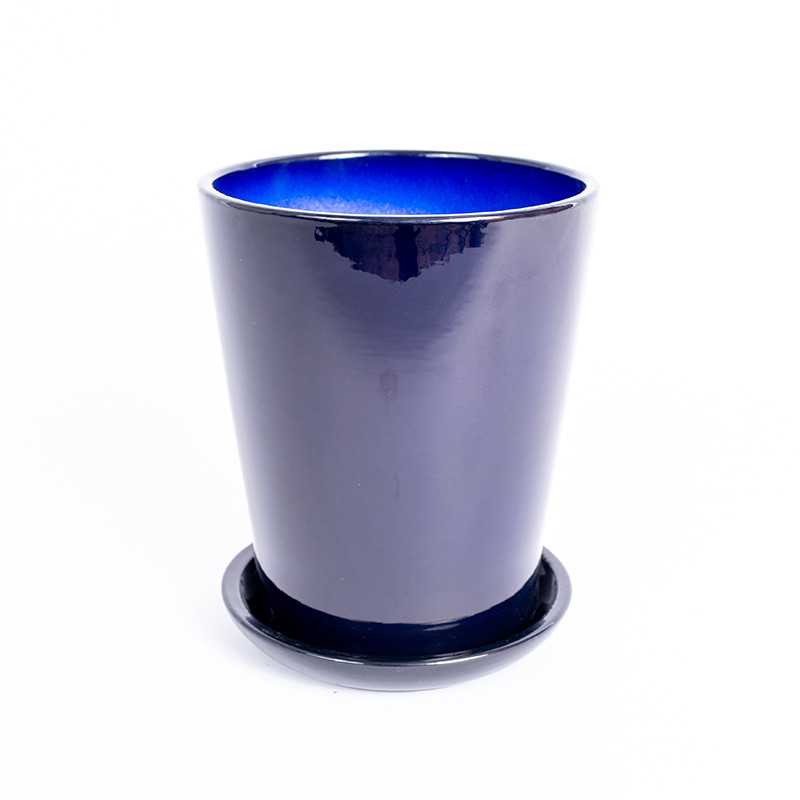 Donica ceramiczna okrągła w odcieniu granatowego połysku. Posiada otwór na spodzie oraz podstawkę w tym samym odcieniu.